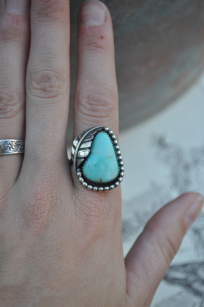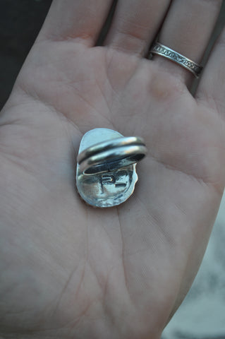 Natural Evans wrapped in sterling silver. Ring is a size 8.