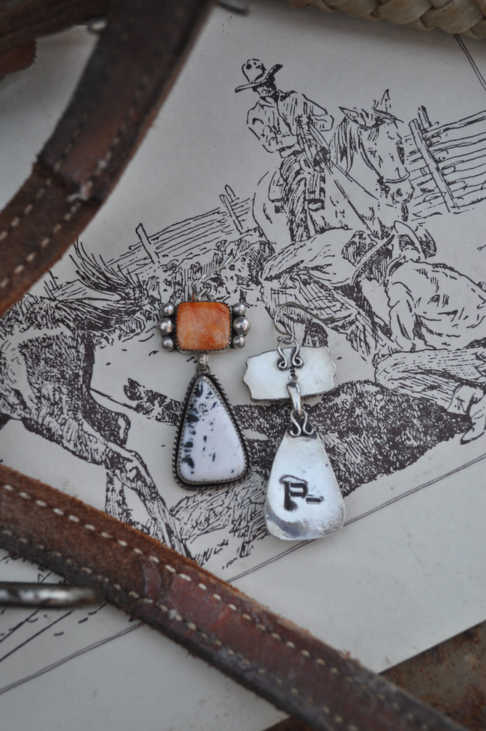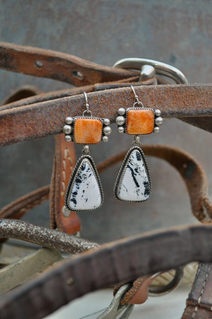 Orange Spiny oyster and white Buffalo wrapped in sterling silver.