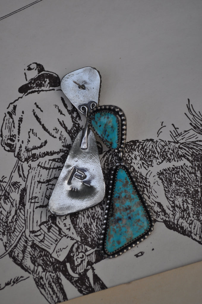 Tyron Turquoise stones wrapped in sterling silver. Both earrings are stamped with brand.